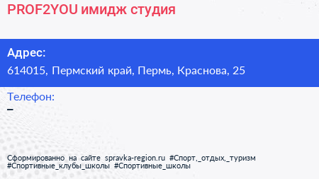 PROF2YOU, имидж-студия по адресу 614015, Пермский край, Пермь, Краснова, 25 в дальнейшем Организация, размещена в следующих категориях: