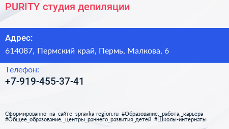 PURITY, студия депиляции по адресу 614087, Пермский край, Пермь, Малкова, 6 в дальнейшем Организация, размещена в следующих категориях:
