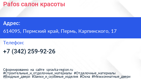 Pafos, салон красоты по адресу 614095, Пермский край, Пермь, Карпинского, 17 в дальнейшем Организация, размещена в следующих категориях: