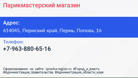 Парикмастерский, магазин по адресу 614045, Пермский край, Пермь, Попова, 16 в дальнейшем Организация, размещена в следующих категориях: