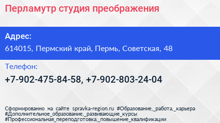 Перламутр, студия преображения по адресу 614015, Пермский край, Пермь, Советская, 48 в дальнейшем Организация, размещена в следующих категориях: