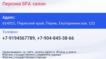 Персона, SPA-салон по адресу 614015, Пермский край, Пермь, Екатерининская, 122 в дальнейшем Организация, размещена в следующих категориях: