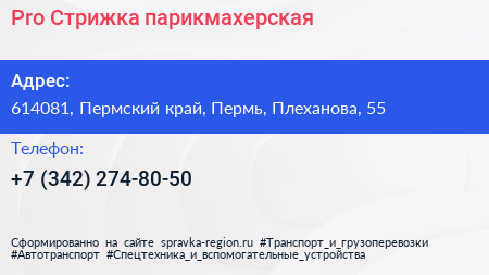 Pro Стрижка, парикмахерская по адресу 614081, Пермский край, Пермь, Плеханова, 55 в дальнейшем Организация, размещена в следующих категориях: