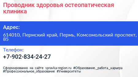 Проводник здоровья, остеопатическая клиника по адресу 614010, Пермский край, Пермь, Комсомольский проспект, 85 в дальнейшем Организация, размещена в следующих категориях: