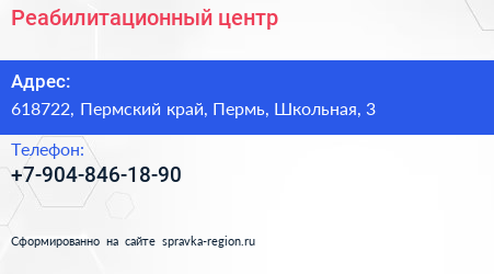 Реабилитационный центр по адресу 618722, Пермский край, Пермь, Школьная, 3 в дальнейшем Организация, размещена в следующих категориях: