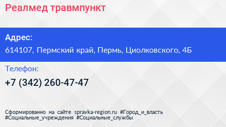 Реалмед, травмпункт по адресу 614107, Пермский край, Пермь, Циолковского, 4Б в дальнейшем Организация, размещена в следующих категориях: