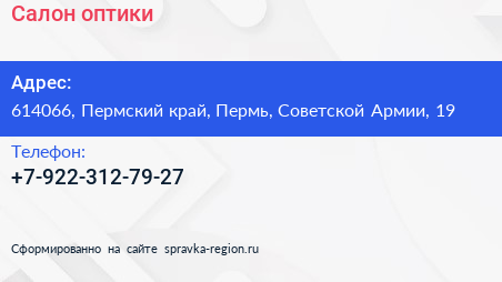 Салон оптики по адресу 614066, Пермский край, Пермь, Советской Армии, 19 в дальнейшем Организация, размещена в следующих категориях: