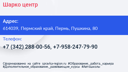 Шарко-центр по адресу 614039, Пермский край, Пермь, Пушкина, 80 в дальнейшем Организация, размещена в следующих категориях: