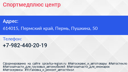 Спортмедплюс, центр по адресу 614015, Пермский край, Пермь, Пушкина, 50 в дальнейшем Организация, размещена в следующих категориях: