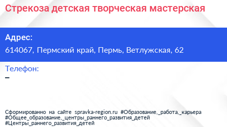 Стрекоза, детская творческая мастерская по адресу 614067, Пермский край, Пермь, Ветлужская, 62 в дальнейшем Организация, размещена в следующих категориях:
