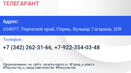 ТЕЛЕГАРАНТ по адресу 614077, Пермский край, Пермь, бульвар Гагарина, 109 в дальнейшем Организация, размещена в следующих категориях: