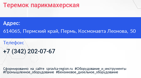 Теремок, парикмахерская по адресу 614065, Пермский край, Пермь, Космонавта Леонова, 50 в дальнейшем Организация, размещена в следующих категориях: