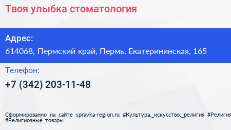 Твоя улыбка, стоматология по адресу 614068, Пермский край, Пермь, Екатерининская, 165 в дальнейшем Организация, размещена в следующих категориях: