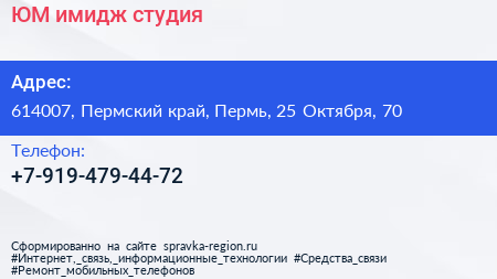 ЮМ, имидж-студия по адресу 614007, Пермский край, Пермь, 25 Октября, 70 в дальнейшем Организация, размещена в следующих категориях: