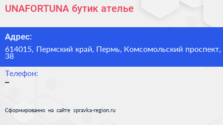 UNAFORTUNA, бутик-ателье по адресу 614015, Пермский край, Пермь, Комсомольский проспект, 38 в дальнейшем Организация, размещена в следующих категориях: