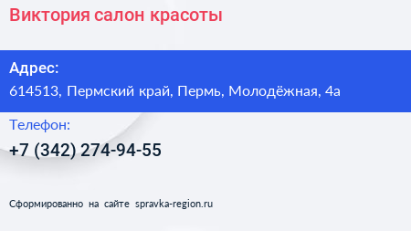 Виктория, салон красоты по адресу 614513, Пермский край, Пермь, Молодёжная, 4а в дальнейшем Организация, размещена в следующих категориях: