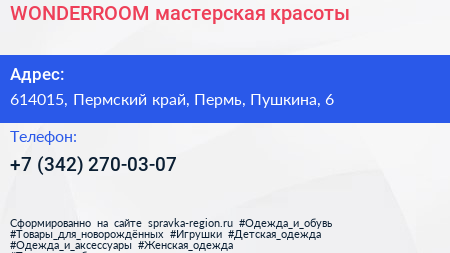 WONDERROOM, мастерская красоты по адресу 614015, Пермский край, Пермь, Пушкина, 6 в дальнейшем Организация, размещена в следующих категориях: