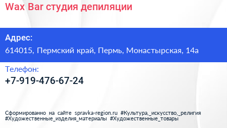 Wax Bar, студия депиляции по адресу 614015, Пермский край, Пермь, Монастырская, 14а в дальнейшем Организация, размещена в следующих категориях: