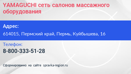 YAMAGUCHI, сеть салонов массажного оборудования по адресу 614015, Пермский край, Пермь, Куйбышева, 16 в дальнейшем Организация, размещена в следующих категориях: