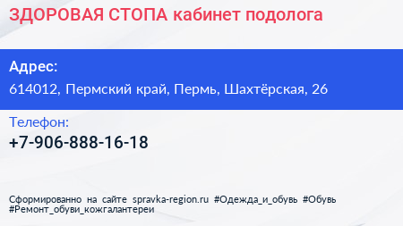 ЗДОРОВАЯ СТОПА, кабинет подолога по адресу 614012, Пермский край, Пермь, Шахтёрская, 26 в дальнейшем Организация, размещена в следующих категориях:
