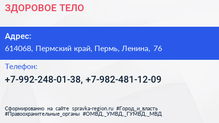 ЗДОРОВОЕ ТЕЛО по адресу 614068, Пермский край, Пермь, Ленина, 76 в дальнейшем Организация, размещена в следующих категориях: