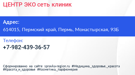 ЦЕНТР ЭКО, сеть клиник по адресу 614015, Пермский край, Пермь, Монастырская, 93Б в дальнейшем Организация, размещена в следующих категориях: