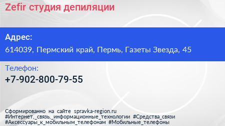 Zefir, студия депиляции по адресу 614039, Пермский край, Пермь, Газеты Звезда, 45 в дальнейшем Организация, размещена в следующих категориях: