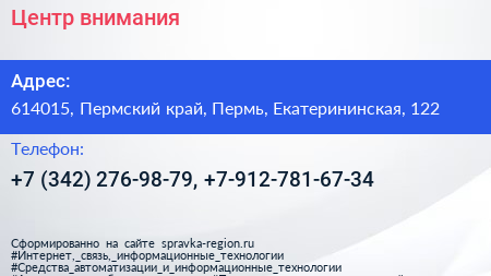 Для связи с организацией воспользуйтесь номером телефона: +7 (342) 276-98-79, +7-912-781-67-34. Ежедневно с 08:00 до 20:00. по предварительной записи: пн-вс, вы можете обратиться в эту организацию.