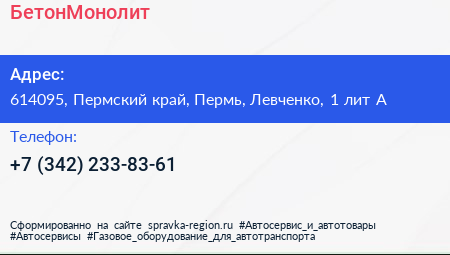 БетонМонолит по адресу 614095, Пермский край, Пермь, Левченко, 1 лит А в дальнейшем Организация, размещена в следующих категориях:
