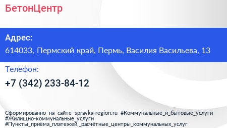 БетонЦентр по адресу 614033, Пермский край, Пермь, Василия Васильева, 13 в дальнейшем Организация, размещена в следующих категориях: