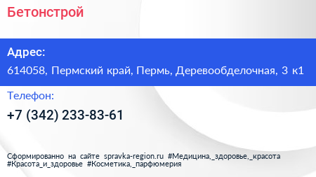 Бетонстрой по адресу 614058, Пермский край, Пермь, Деревообделочная, 3 к1 в дальнейшем Организация, размещена в следующих категориях: