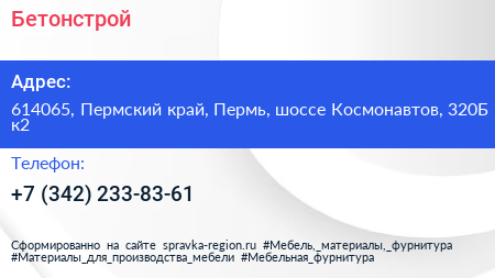 Бетонстрой по адресу 614065, Пермский край, Пермь, шоссе Космонавтов, 320Б к2 в дальнейшем Организация, размещена в следующих категориях: