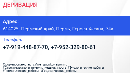 ДЕРИВАЦИЯ по адресу 614025, Пермский край, Пермь, Героев Хасана, 74а в дальнейшем Организация, размещена в следующих категориях: