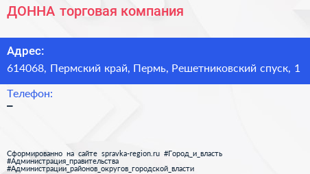 ДОННА, торговая компания по адресу 614068, Пермский край, Пермь, Решетниковский спуск, 1 в дальнейшем Организация, размещена в следующих категориях: