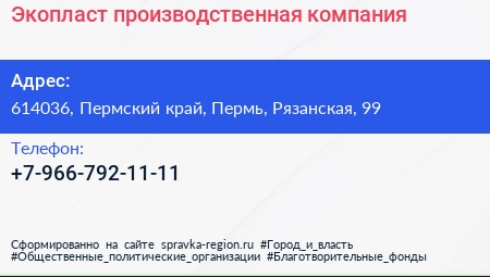 Экопласт, производственная компания по адресу 614036, Пермский край, Пермь, Рязанская, 99 в дальнейшем Организация, размещена в следующих категориях: