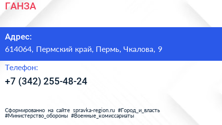 ГАНЗА по адресу 614064, Пермский край, Пермь, Чкалова, 9 в дальнейшем Организация, размещена в следующих категориях: