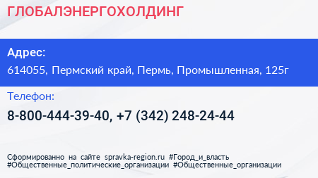 ГЛОБАЛЭНЕРГОХОЛДИНГ по адресу 614055, Пермский край, Пермь, Промышленная, 125г в дальнейшем Организация, размещена в следующих категориях: