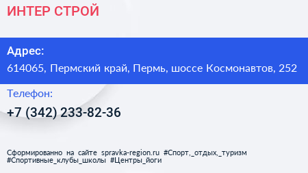 ИНТЕР-СТРОЙ по адресу 614065, Пермский край, Пермь, шоссе Космонавтов, 252 в дальнейшем Организация, размещена в следующих категориях: