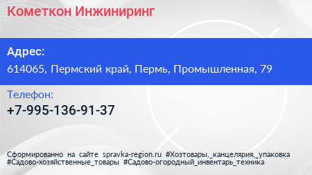 Кометкон-Инжиниринг по адресу 614065, Пермский край, Пермь, Промышленная, 79 в дальнейшем Организация, размещена в следующих категориях: