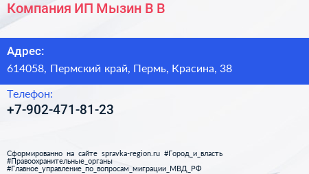 Компания, ИП Мызин В.В. по адресу 614058, Пермский край, Пермь, Красина, 38 в дальнейшем Организация, размещена в следующих категориях:
