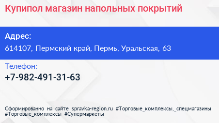 Купипол, магазин напольных покрытий по адресу 614107, Пермский край, Пермь, Уральская, 63 в дальнейшем Организация, размещена в следующих категориях: