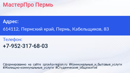 МастерПро-Пермь по адресу 614112, Пермский край, Пермь, Кабельщиков, 83 в дальнейшем Организация, размещена в следующих категориях: