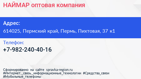 НАЙМАР, оптовая компания по адресу 614025, Пермский край, Пермь, Пихтовая, 37 к1 в дальнейшем Организация, размещена в следующих категориях: