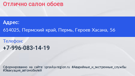 Отлично, салон обоев по адресу 614025, Пермский край, Пермь, Героев Хасана, 56 в дальнейшем Организация, размещена в следующих категориях: