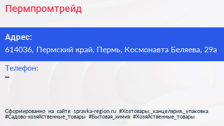 Пермпромтрейд по адресу 614036, Пермский край, Пермь, Космонавта Беляева, 29а в дальнейшем Организация, размещена в следующих категориях:
