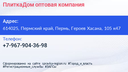 ПлиткаДом, оптовая компания по адресу 614025, Пермский край, Пермь, Героев Хасана, 105 к47 в дальнейшем Организация, размещена в следующих категориях: