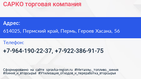 САРКО, торговая компания по адресу 614025, Пермский край, Пермь, Героев Хасана, 56 в дальнейшем Организация, размещена в следующих категориях: