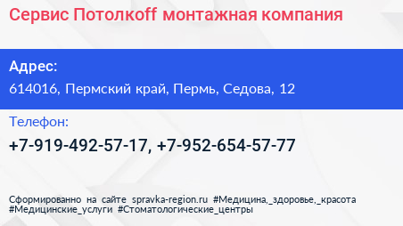 Сервис Потолкоff, монтажная компания по адресу 614016, Пермский край, Пермь, Седова, 12 в дальнейшем Организация, размещена в следующих категориях: