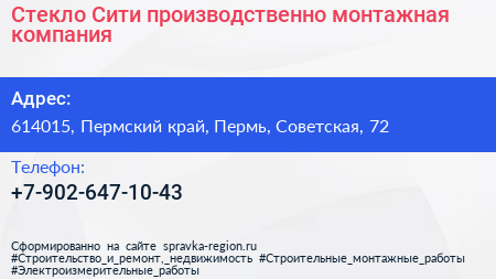 Стекло Сити, производственно-монтажная компания по адресу 614015, Пермский край, Пермь, Советская, 72 в дальнейшем Организация, размещена в следующих категориях: