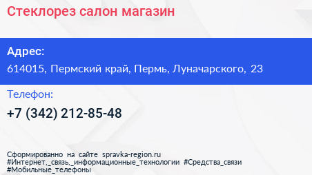 Стеклорез, салон-магазин по адресу 614015, Пермский край, Пермь, Луначарского, 23 в дальнейшем Организация, размещена в следующих категориях: